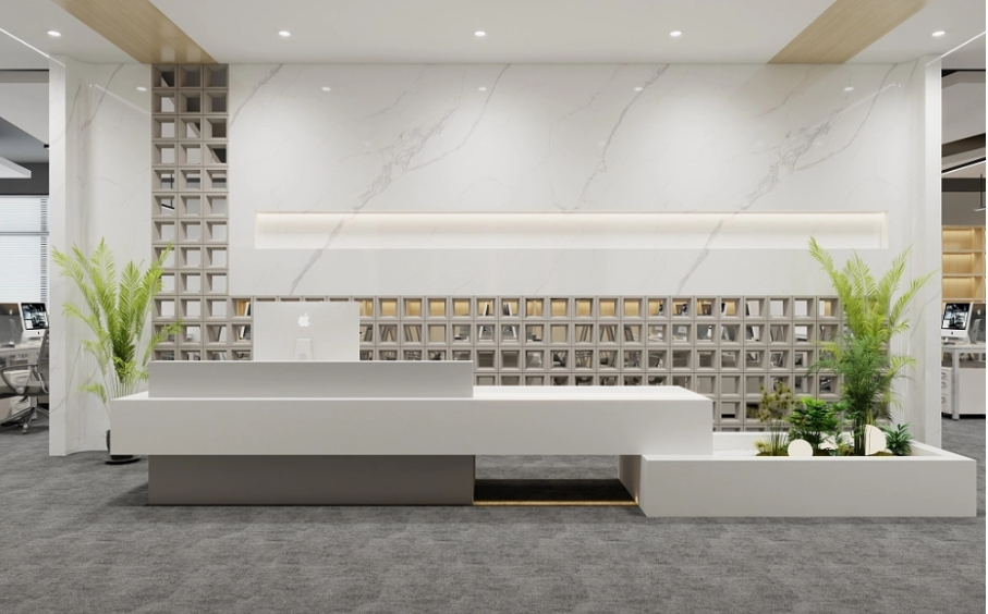 1、接待區接待臺設計:接待臺是進門區域的核心功能區域,其設計應與企業形象和空間風格相匹配。接待臺的高度一般在1.1 - 1.2米左右,寬度根據實際需求確定。可選擇木質、石材或金屬等材質制作接待臺,搭配舒適的座椅,為來訪者提供良好的接待體驗。